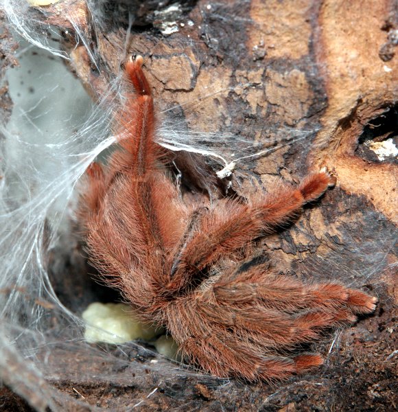 17 января полинял мой Т.гигас 8-й раз. Линял фигово, на пузе, на наклонной щепке, почти без паутины. Когда вытащил шкуру и начал расправлять, под хелицерами оказалась небольшая лужица, при рассмотрении не обнаружил на экзувии одного зуба. Паучек еще мелкий, см 3 от силы. Вытаскивать не рискнул, а через стекло видно плохо, но вроде зубки на месте. Решил подождать первой кормежки и посмотреть. Первого свера взял ночью, но всего не съел. Треть если не больше осталось. Через неделю ситуация повторилась, третий раз съел всего. После этого в отказ. По ночам вроде ползает, а на свету забъется в угол, весь съежится и сидит часами. Фиг с ним, думаю, дождемся очередной линьки, авось все проблемы закончатся. Худоват, конечно, но должно хватить.