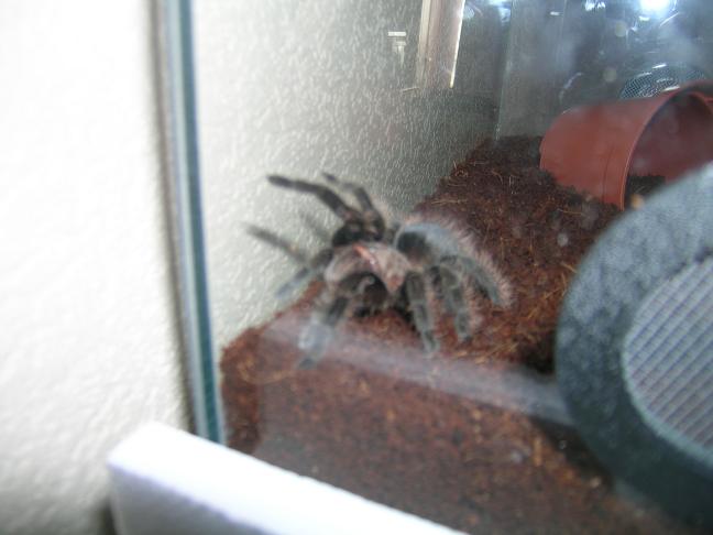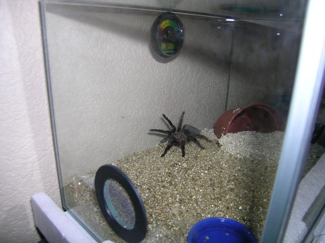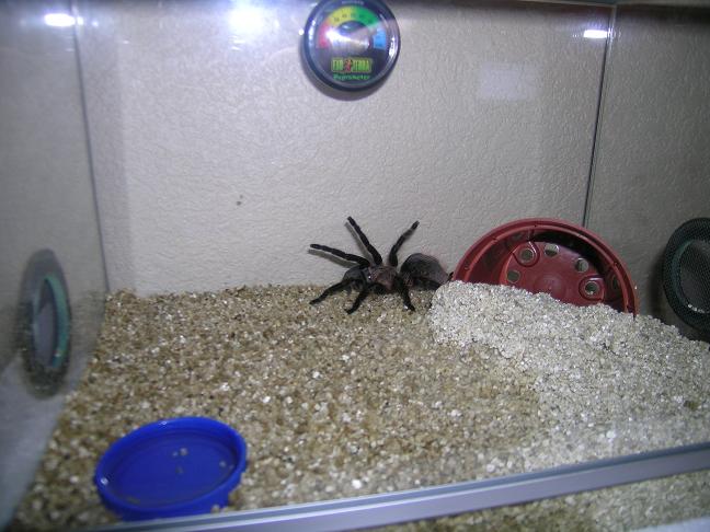 Udav посоветовал выпустить уже туда паучка, так что уже бродит и осваивается, приимущественно по стенкам, но и на кокос уже слазиет