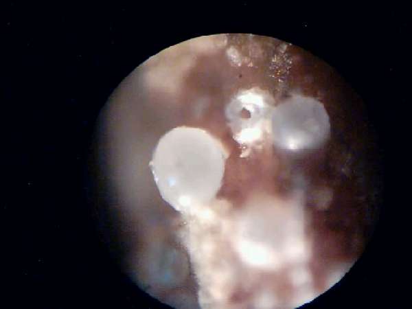0.2 - 0.3 мм ,заполненных беловатой жидкостью .Размер приблизительный , использовался микроскоп 80 крат.