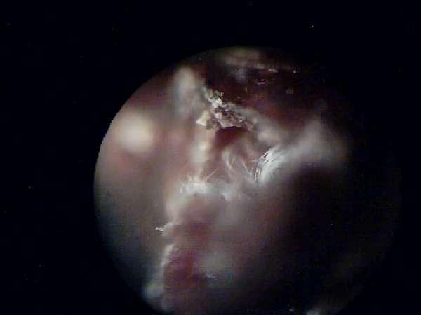 Через некоторое время эти пузырьки вскрылись с образованием скрученных по спирали беловатых волосков толшиной 0.01-0.03 мм , волоски хрупкие при касание ломаются ,кто вышел из этих