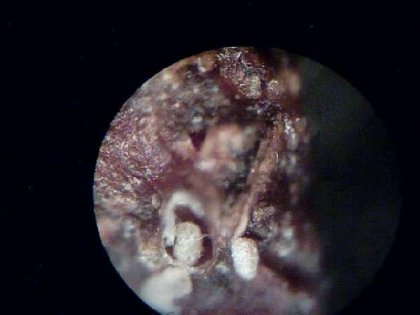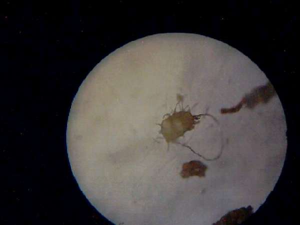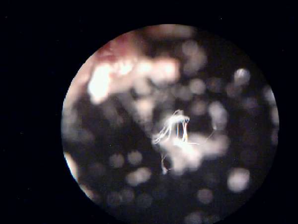 Через некоторое время эти пузырьки вскрылись с образованием скрученных по спирали беловатых волосков толшиной 0.01-0.03 мм , волоски хрупкие при касание ломаются ,кто вышел из этих